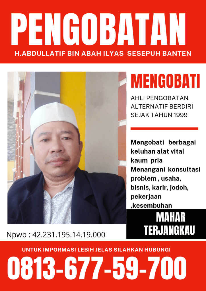 KLINIK ABAH ILYAS H.ABDULLATIF — telah memiliki izin dikesehatan sejak tahun 2004 sebagai Pengobat dipengobatan alternatif, tradisional, dengan ilmu warisan orang tua, secara turun temurun, yang sudah memiliki sejarah puluhan tahun.